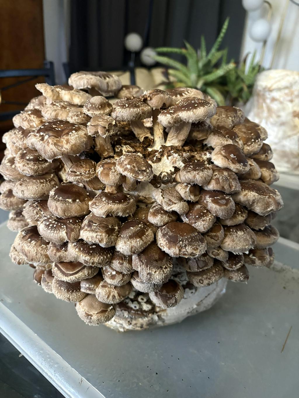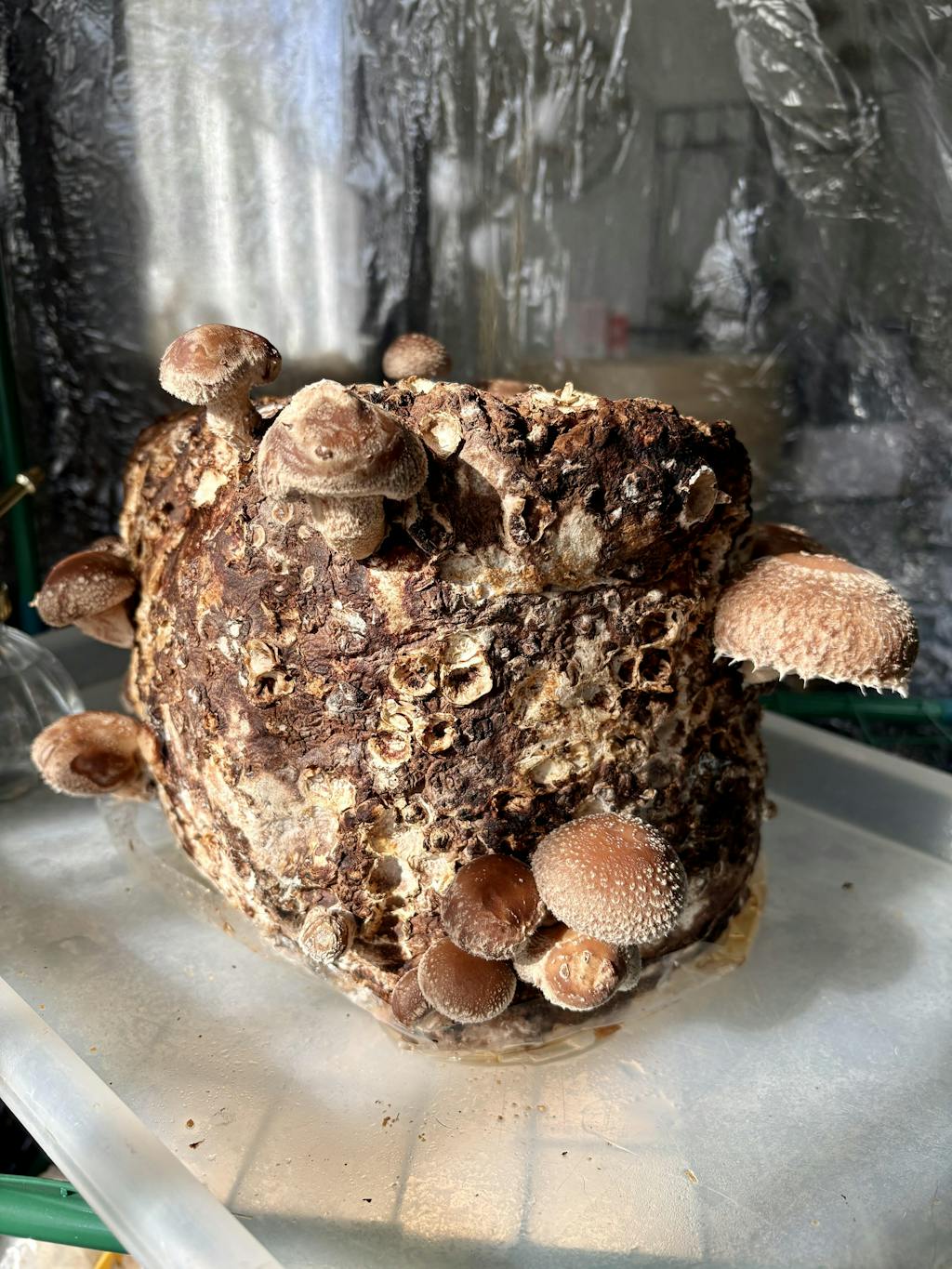 Le shiitaké peut être cultivé à l'intérieur (cuisine, garage, cave). Il a besoin de lumière indirecte et d'une humidité de 80 à 90%. Évitez les courants d'air, les radiateurs et le soleil direct pour prévenir le dessèchement du ballot. Pour augmenter l'humidité, pulvérisez de l'eau ou arrosez 1 à 2 fois par jour. Recouvrez le ballot d'un plastique transparent percé pour maintenir l'humidité tout en permettant la respiration.