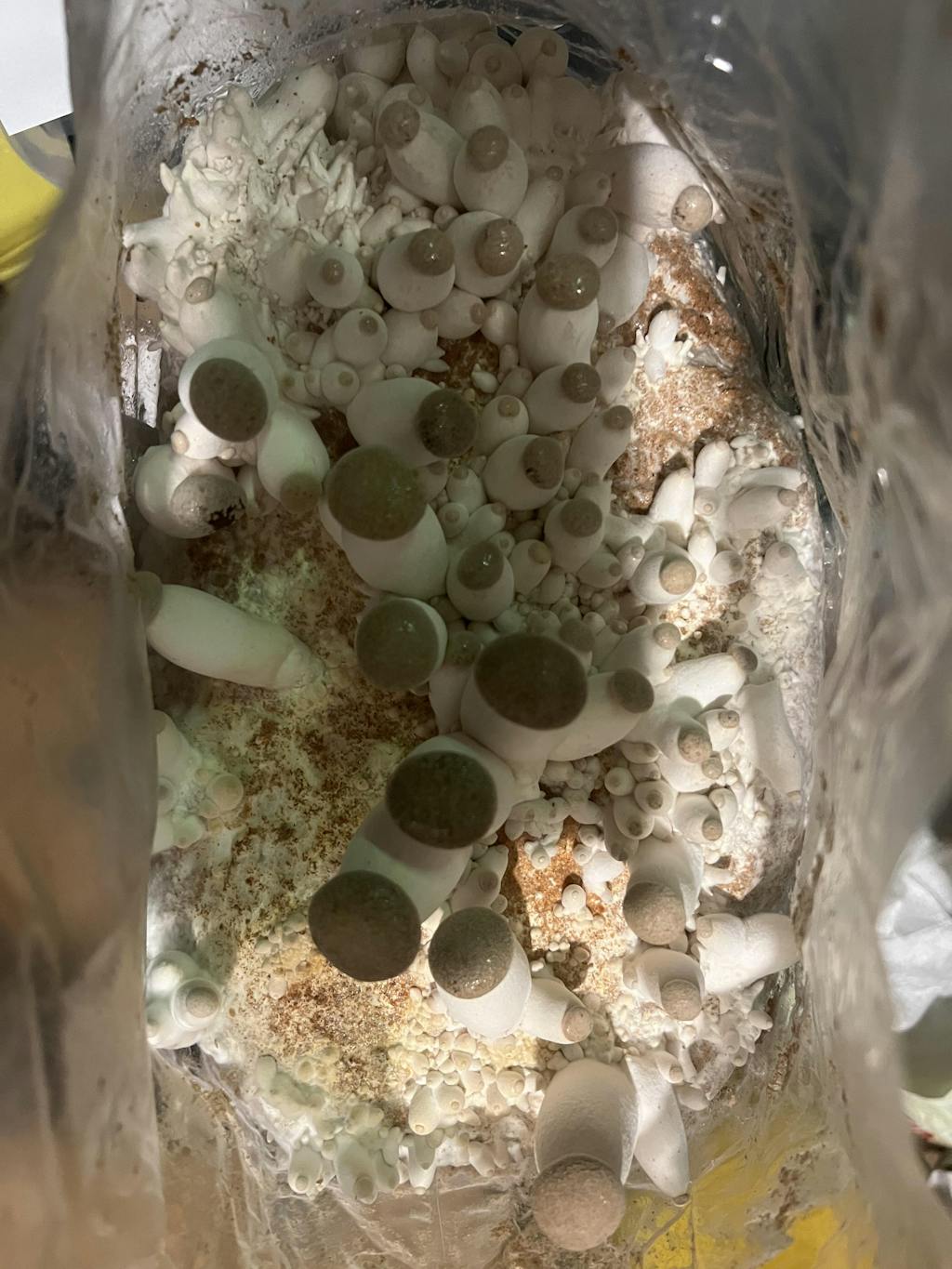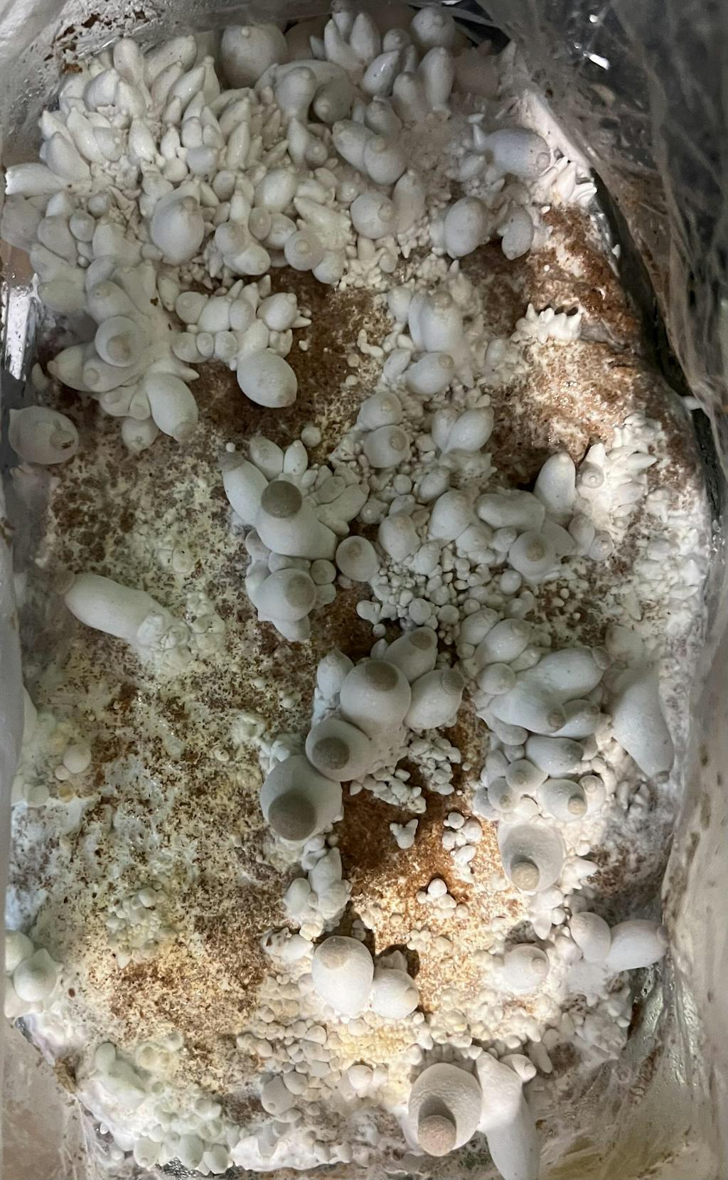 - Ouvrir le dessus du sac en laissant 15-20 cm de plastique au-dessus du substrat, attendre l'apparition des primordias ("bourgeons" de champignons), puis redescendre progressivement le plastique au niveau du substrat.
